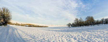 Scenery. Winter, cold day. In a white, snowy field there are single, relict pines. Blue sky above the horizon.