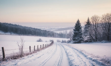 AI Generated. Winter Sunrise Over Snowy Landscape with Trees and Path