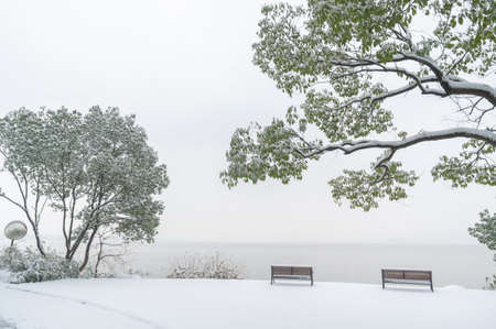 Winter landscape with a bridge over the river. Snowfall in the park.