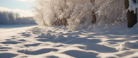 A breathtaking winter scene. Frosty trees stand in a snow-covered field under a clear blue sky.