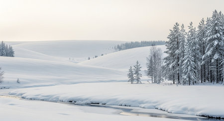 Discover a tranquil winter river scene, featuring snow-covered banks, frosty trees, and gentle light creating a serene atmosphere in a stunning natural environment.
