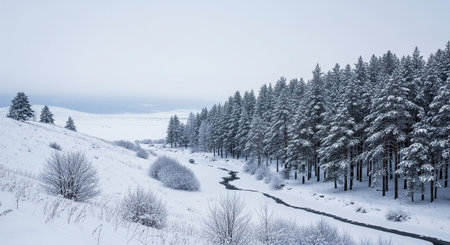 AI Generated. Serene winter landscape with frosted trees and a winding stream at twilight hour
