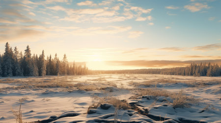 A tranquil sunrise casts a golden glow over a vast snow-covered field bordered by tall pine trees, enhancing the serene winter atmosphere filled with hope and beauty.