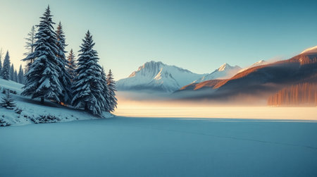 Serene winter scene with snow-covered trees and a frozen lake in the mountains