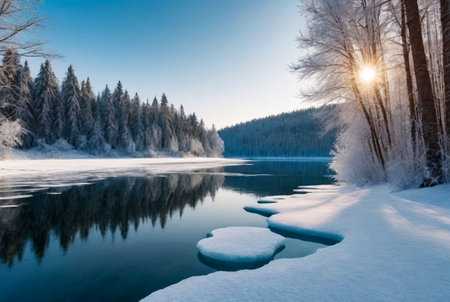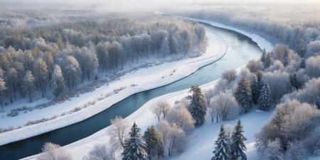 Discover a tranquil winter river scene, featuring snow-covered banks, frosty trees, and gentle light creating a serene atmosphere in a stunning natural environment.