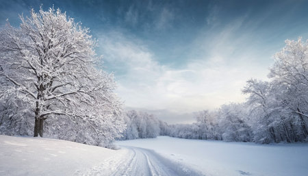 A serene winter landscape featuring a winding road through a snow-covered forest