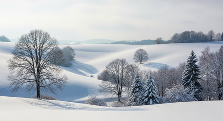 Winter wonderland: Snow-covered hills with bare trees and evergreens
