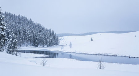 Serene Winter Landscape: Snow-Covered Trees Reflecting on a Cold River