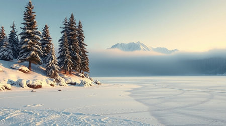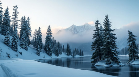 Experience the beauty of a tranquil winter landscape featuring snow-covered trees and a calm lake, all set against a breathtaking mountain backdrop under a misty sky.
