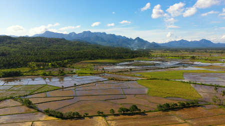 Rice fields are flooded with water. Tropical landscape with fertile soil. Leyte Island, Philippines. Agriculture concept.