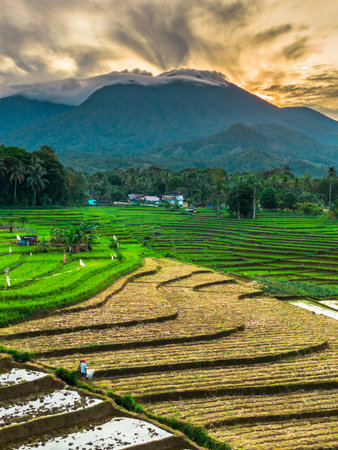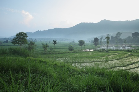 View of Indonesia in the morning, green rice fields sun rising brightly over the mountain