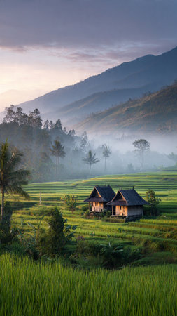 Scenic rice terraces in misty morning light showcasing agricultural landscape.