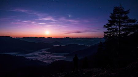 Misty mountain range under a dark teal twilight sky with distant stars and a hint of green aurora