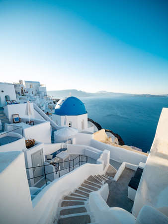 White architecture on Santorini island, Greece. Beautiful landscape at sunset, sea view.