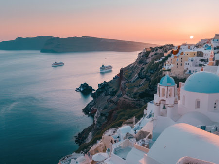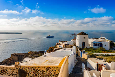 View of Oia town with mills in Santorini island in Greece. Summer vacation and holiday concept, luxury travel. Wonderful scenery, cruise ships and white architecture. amazing scenery