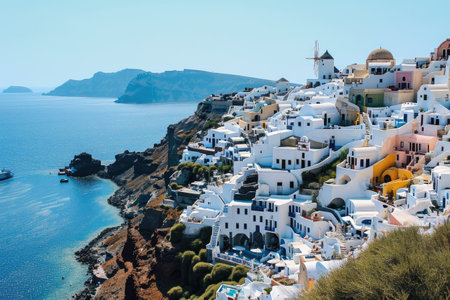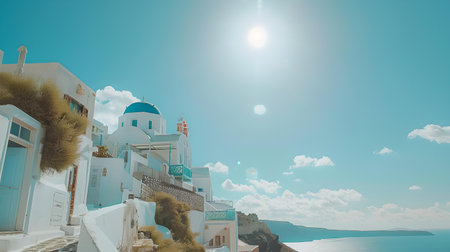Picturesque santorini with white architecture under a clear blue sky, ideal for travel promotion and postcards. A.I.