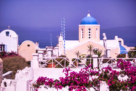 Oia, Santorini, Greece - April 25, 2019: Famous town, village panoramic view with blue church dome and colorful houses