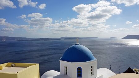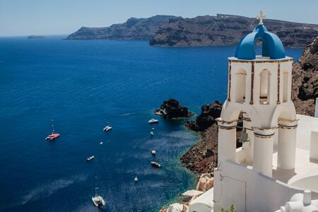 Santorini, Greece - September 11, 2017: Typical church in santorini island with blue roof top against seascape in the famous town of oia
