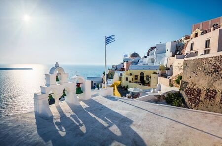 Incredible morning view of Santorini island. Picturesque spring scene of the famous Greek resort - Fira, Greece, Europe. Traveling concept background.