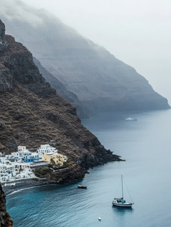 A quaint village with white buildings sits against rugged cliffs by the sea. Boats float on peaceful water with fog rolling over the landscape creating a serene atmosphere.