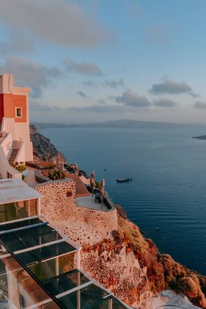 Sunset overlooking the caldera and the sea in the village of Imerovigli on the island of Santorini in the summer. Greece.