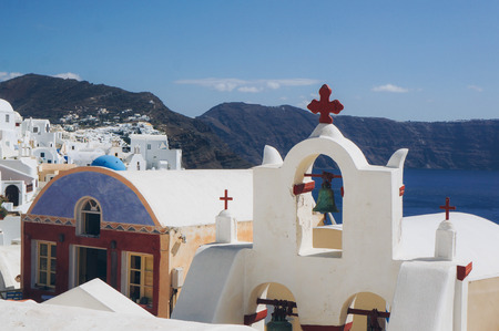 Santorini skyline with buildings and bell tower in Greece.