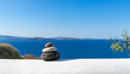 Close-up shot of pebbles stacked on each other in a balance with santorini caldera in the background