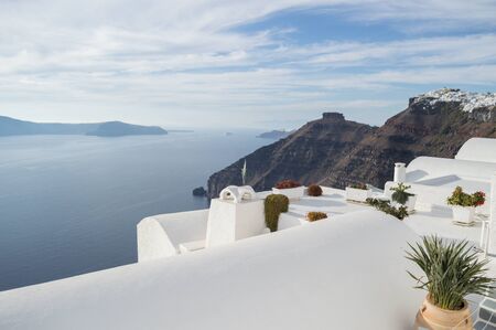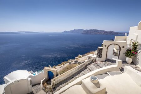 White architecture on Santorini island, Greece. Beautiful landscape with sea view.