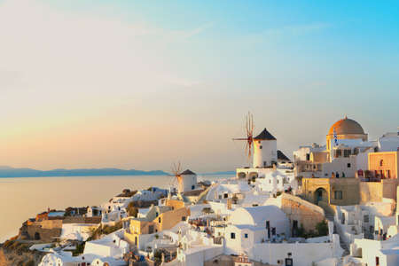 View on Greek village with wind mill on cliffs along the ocean with last sunbeams, Oia, Santorini, Greece