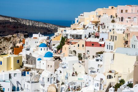 Santorini island, Greece. Oia, Fira town. Traditional and famous houses and churches over the Caldera, Aegean sea