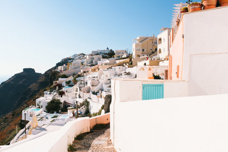 Thira city on Santorini island on a clear sunny day. Cliff overlooking the sea and the caldera.