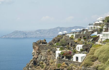View of white greek houses on the sea coast of Santorini island, Greece.