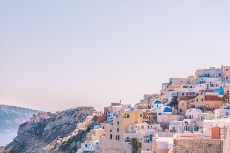 Oia city on Santorini island on a clear sunny day. Cliff overlooking the sea and the caldera.
