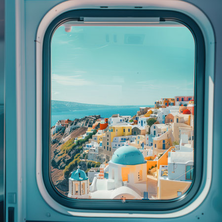 Panoramic view of Santorini island Greece from airplane window shows white frame contrasting with vibrant yellow orange buildings blue domes and clear blue sky perfect for travel agency tours