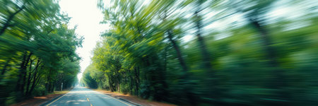 Scenic drive through a tree-lined road in early morning light capturing natures beauty and tranquility