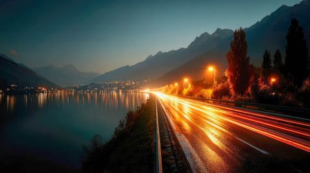 Bright light trails from vehicles illuminate the highway as it stretches towards a picturesque lakeside city during a calm night. The serene water reflects the city lights.