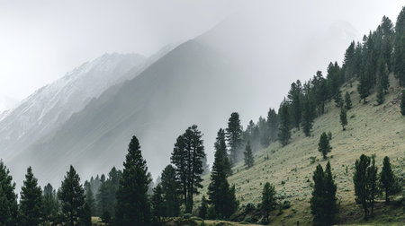 Mountain landscape with pine trees and foggy clouds in the background