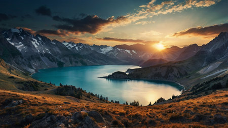 panorama of sunset and snow covered peaks in the background Switzerland