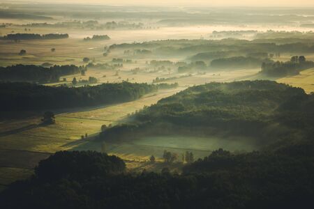 Experience the breathtaking beauty of a misty valley surrounded by rolling hills under a clear sky at dawn, embodying nature's serene tranquility and vibrant colors.