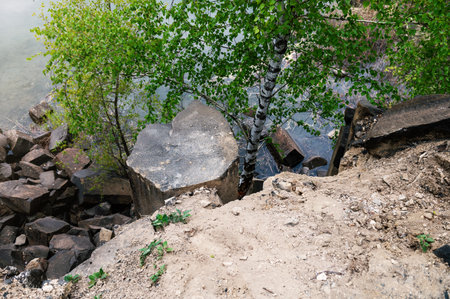 Landslide zone on Black Sea coast. Rock of sea rock shell. Zone of natural disasters during rainy season. Large masses of earth slip along slope of hill, destroy houses. Landslide - threat to life