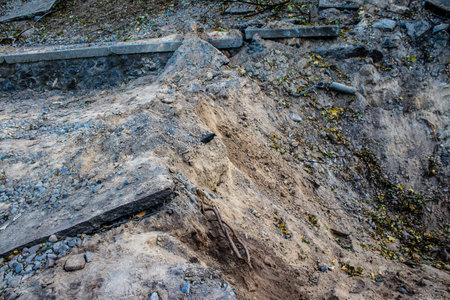 Fallen rocks, dirt, and broken tree roots forming a natural landslide debris background.
