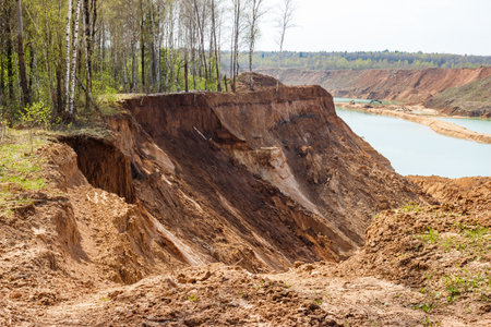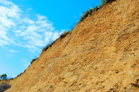 Sharp steep cliff on a sandy quarry, layers of soil, sand and loam
