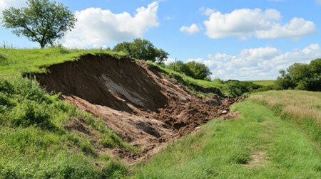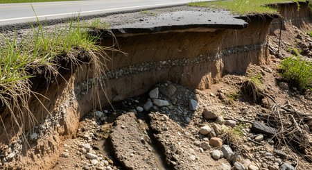 The edge of an asphalt road has collapsed due to severe soil erosion, revealing a cross-section of the earth with different layers of soil and gravel. The image illustrates the effects of landslides, water damage, and failing infrastructure.