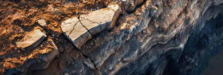 Close up view of a fault line revealing the effects of seismic activity, with cracked bedrock and shifted earth layers highlighting the power of geological forces