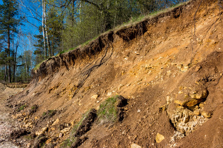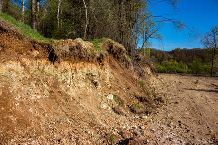 Outcrop of geological rocks. The bedrock is clay and limestone topped with Quaternary deposits. Kaluzhskiy region, Russia