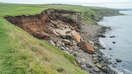 This image captures the dramatic erosion of a coastal cliff, revealing a broken landscape of rocks and earth along a serene shoreline under a cloudy sky.