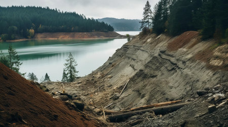 a serene lake landslide, nestled between towering pine trees, creates a breathtaking scenery, with the gentle lapping of water against the shore, surrounded by lush greenery, evoking a sense of tranquility and harmony with nature, perfect for outdoor enthusiasts and photographers. ai generated