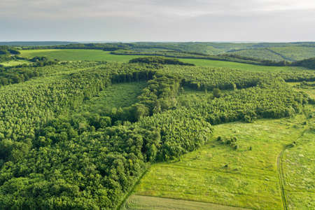 Aerial Photography from the top of the park, a valley with trees, pastures. Forest roads. Picturesque landscape. High quality photo