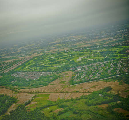 Generative AI : Aerial view of lake surrounded by trees and farmland with dry rice fields after harvest Nakhon Luang province of Ayutthaya Thailand