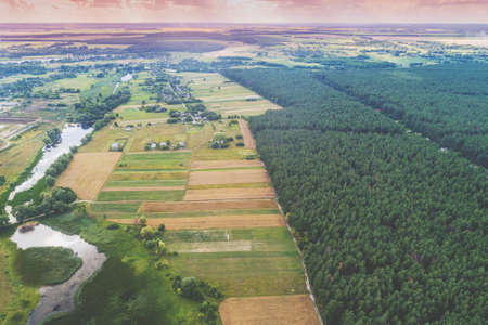 Summer rural landscape, aerial view. View of plowed field and forest in the evening